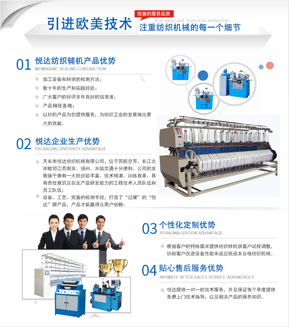 天長(zhǎng)市悅達(dá)紡織機(jī)械有限公司座落在皖東天長(zhǎng)市仁和集鎮(zhèn)人民西路88號(hào),公司位于蘇皖交界、長(zhǎng)江北岸毗鄰江蘇南京、揚(yáng)州、水陸交通十分便利。 公司是主要生產(chǎn)紡織平車(chē)安裝工具、紡部輔件及配件綜合性企業(yè)。已有二十多年的生產(chǎn)歷史,在激烈的市場(chǎng)競(jìng)爭(zhēng)中始終保持優(yōu)良的質(zhì)量、優(yōu)化的價(jià)格、齊全的品種優(yōu)勢(shì)。產(chǎn)品暢銷(xiāo)全國(guó)各地,深受新老客戶(hù)的好評(píng)。 公司以服務(wù)客戶(hù)滿(mǎn)足用戶(hù)為己任,不斷提高產(chǎn)品加工精度,拓展系列品種,以高標(biāo)準(zhǔn)、高起點(diǎn)滿(mǎn)足客戶(hù)需求。公司精神:創(chuàng)新、開(kāi)拓、務(wù)實(shí)。公司宗旨:追求誠(chéng)信、追求質(zhì)量、追求服務(wù)、為用戶(hù)著想。